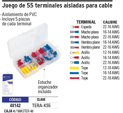 Juego de 55 terminales aisladas para cable, Volteck