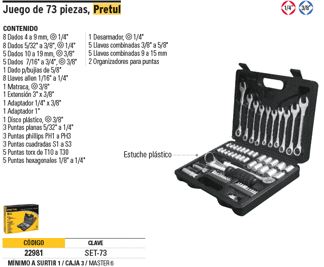 Juego de herramientas de 70 piezas 1/4′ y 3/8′ marca Pretul