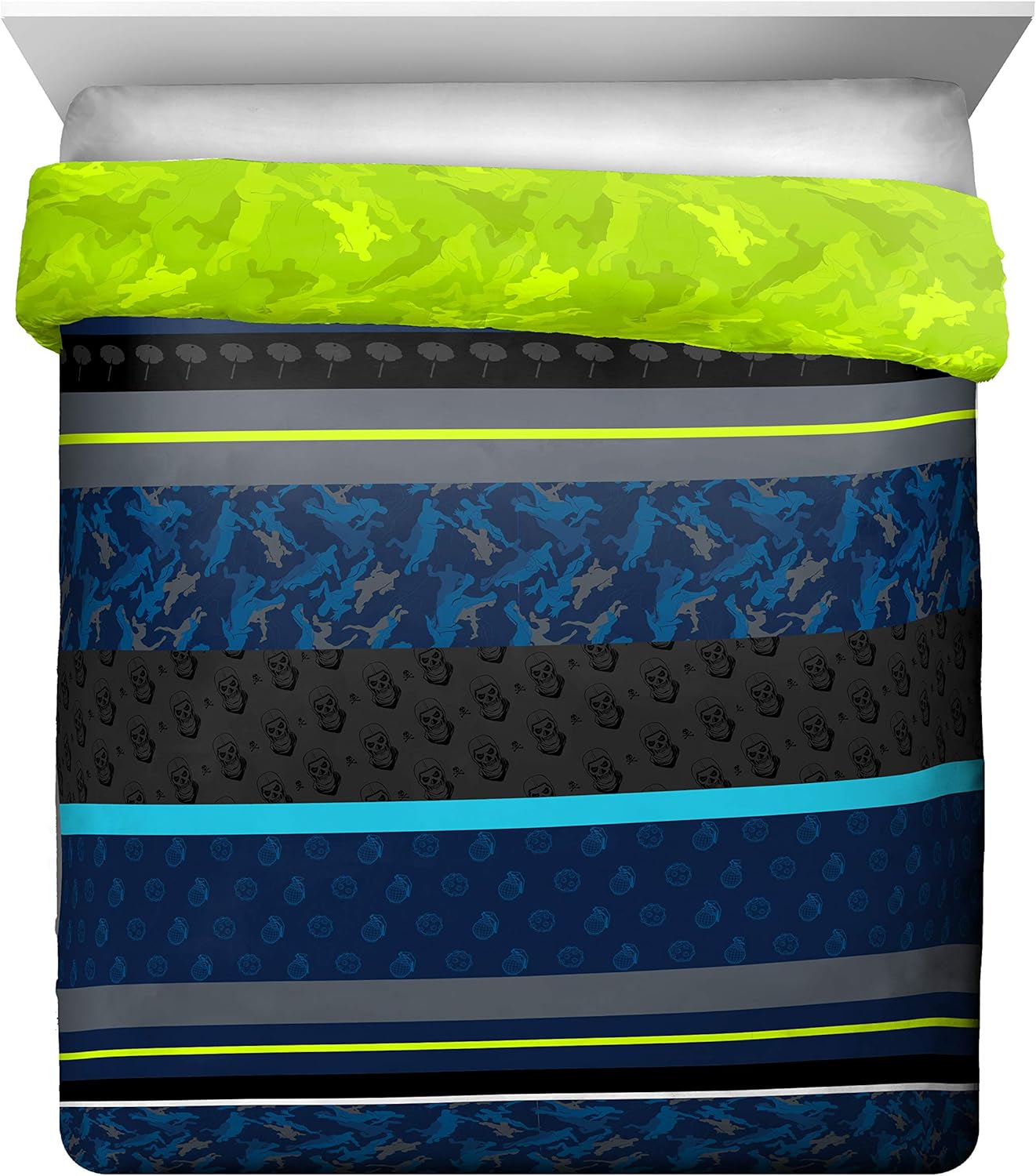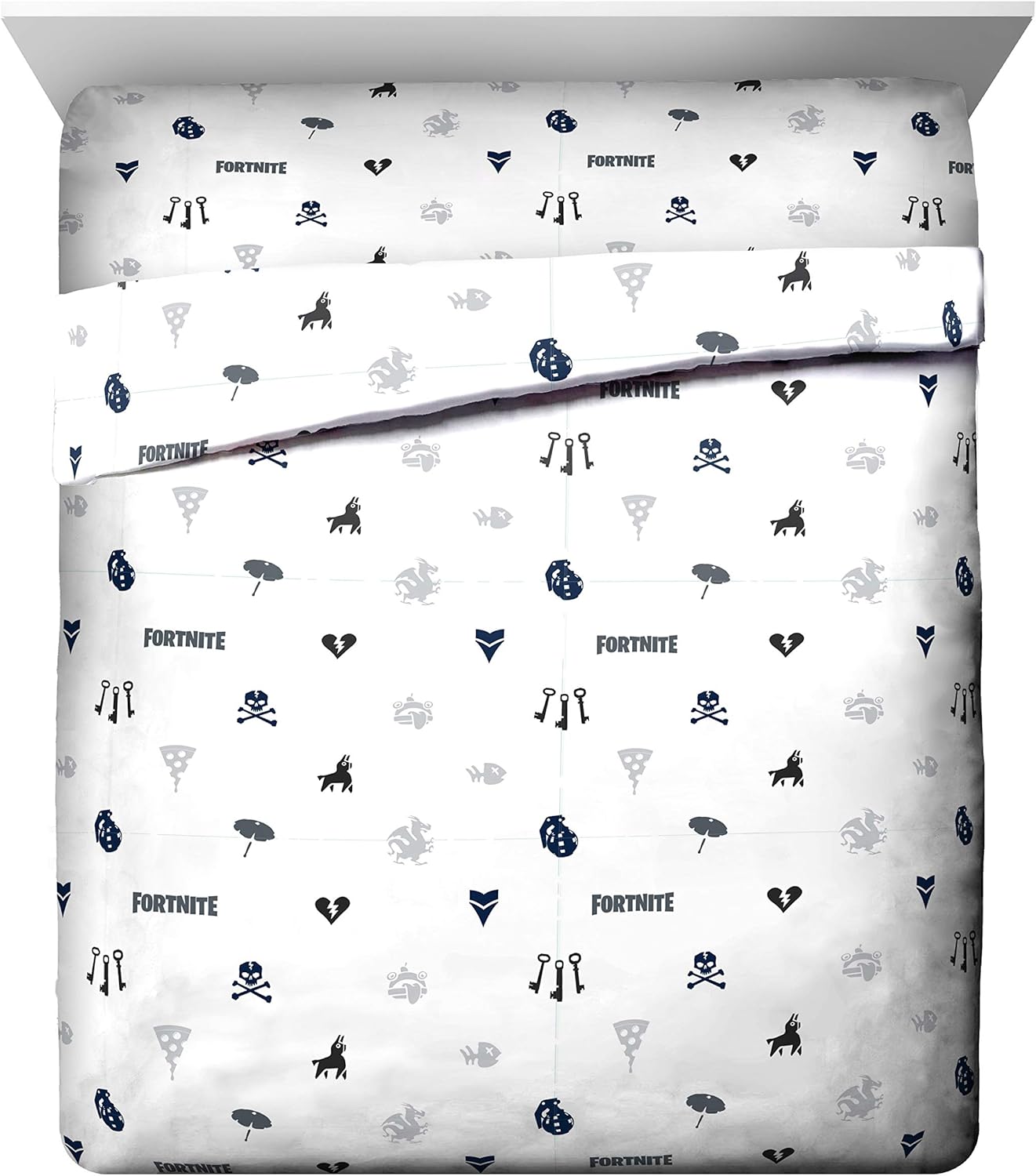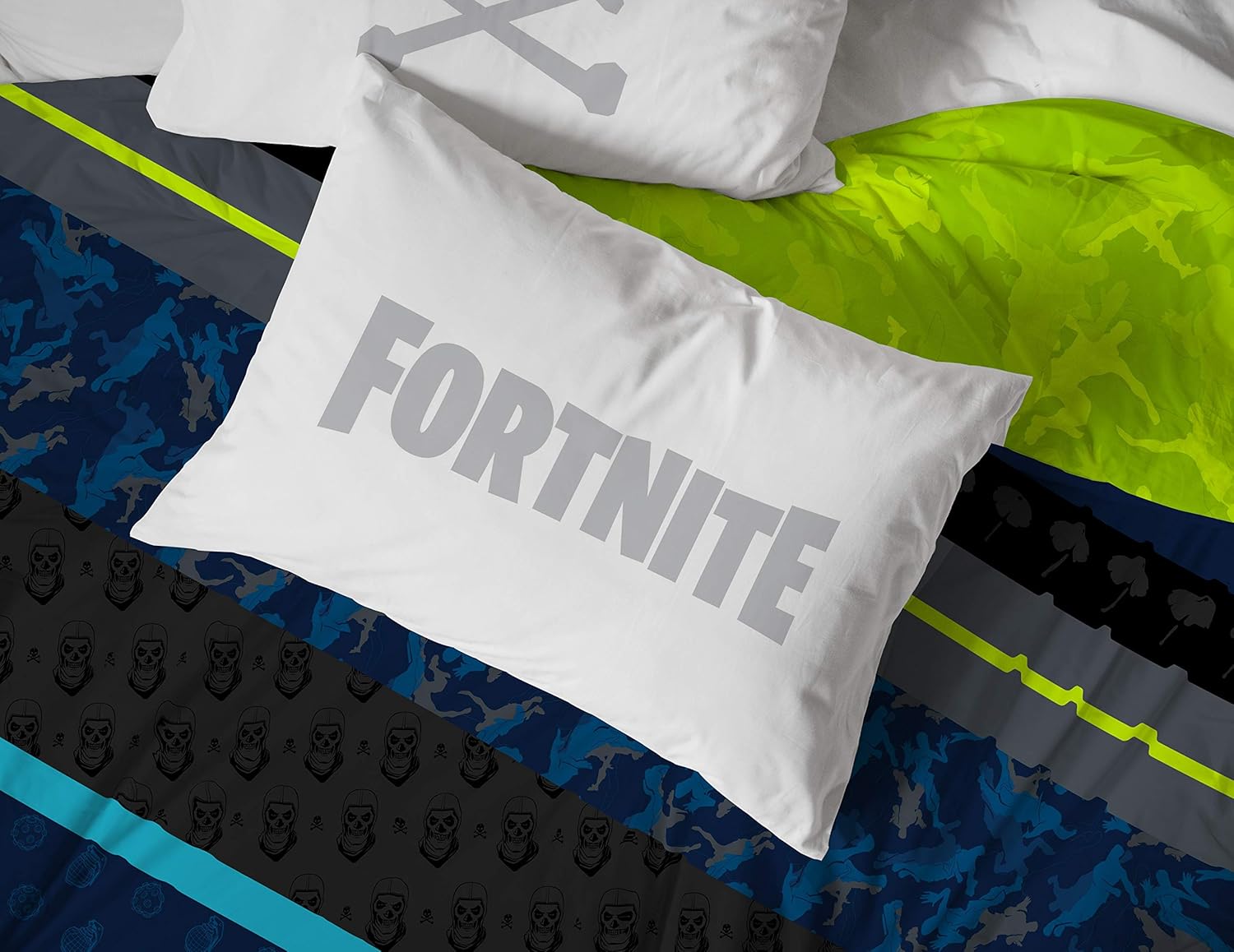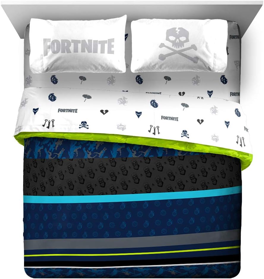 Ajuste perfecto y diseño divertido – Este juego de cama matrimonial de Fortnite incluye (1) edredón matrimonial de 193 x 218 cm, (1) sábana bajera ajustable de 137 x 190 cm, (1) sábana encimera de 206 x 244 cm, y 2 fundas de almohada estándar de 51 x 76 cm. Añade un toque de encanto decorativo a tu habitación con nuestro moderno y súper suave juego de cama Fortnite.