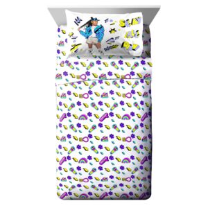 Edredón de 76 x 86, (2) fundas de almohada de 20 x 26, reborde de 2 pulgadas (tamaño terminado de 24 x 30), sábana plana de 81 x 96, sábana ajustable de 54 x 75 x 10, (2) fundas de almohada de 20 x 30