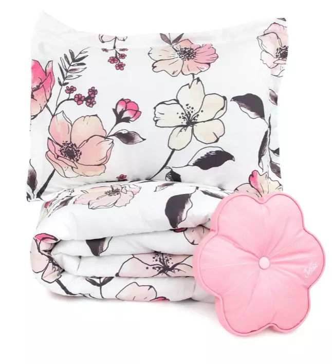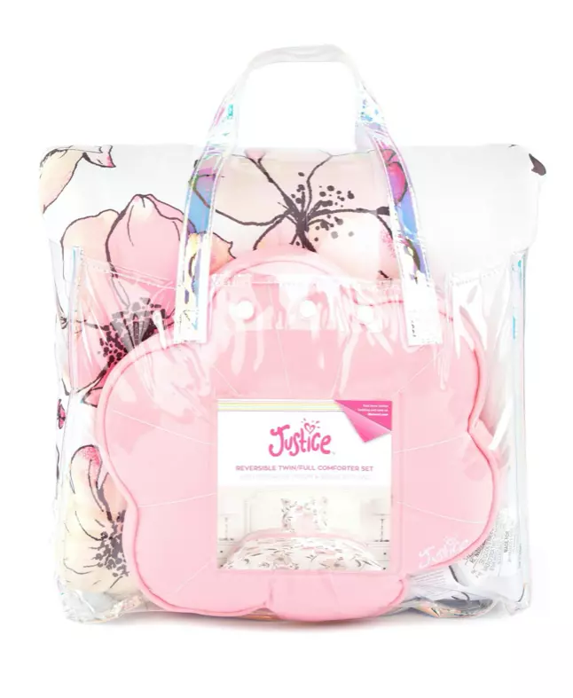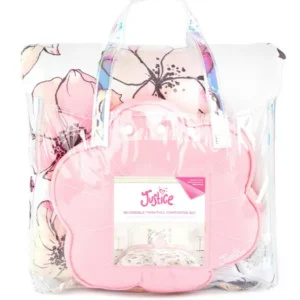 ¡Ilumina tu habitación con este juego de edredón y farsa Justice de 4 piezas rosa floral TWIN/FULL con almohada decorativa adicional! Hecho de microfibra 100 % súper suave, este edredón y farsa es lavable a máquina para un cuidado fácil y conveniente. El patrón floral de gran tamaño es la manera perfecta de elevar tu ropa de cama. La almohada decorativa rosa coordinada en forma de flor agrega el toque final a este juego de cama femenino.