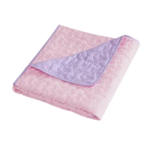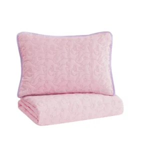 El conjunto de colcha reversible presenta un diseño unicorn bordado púrpura juguetón en ambos lados