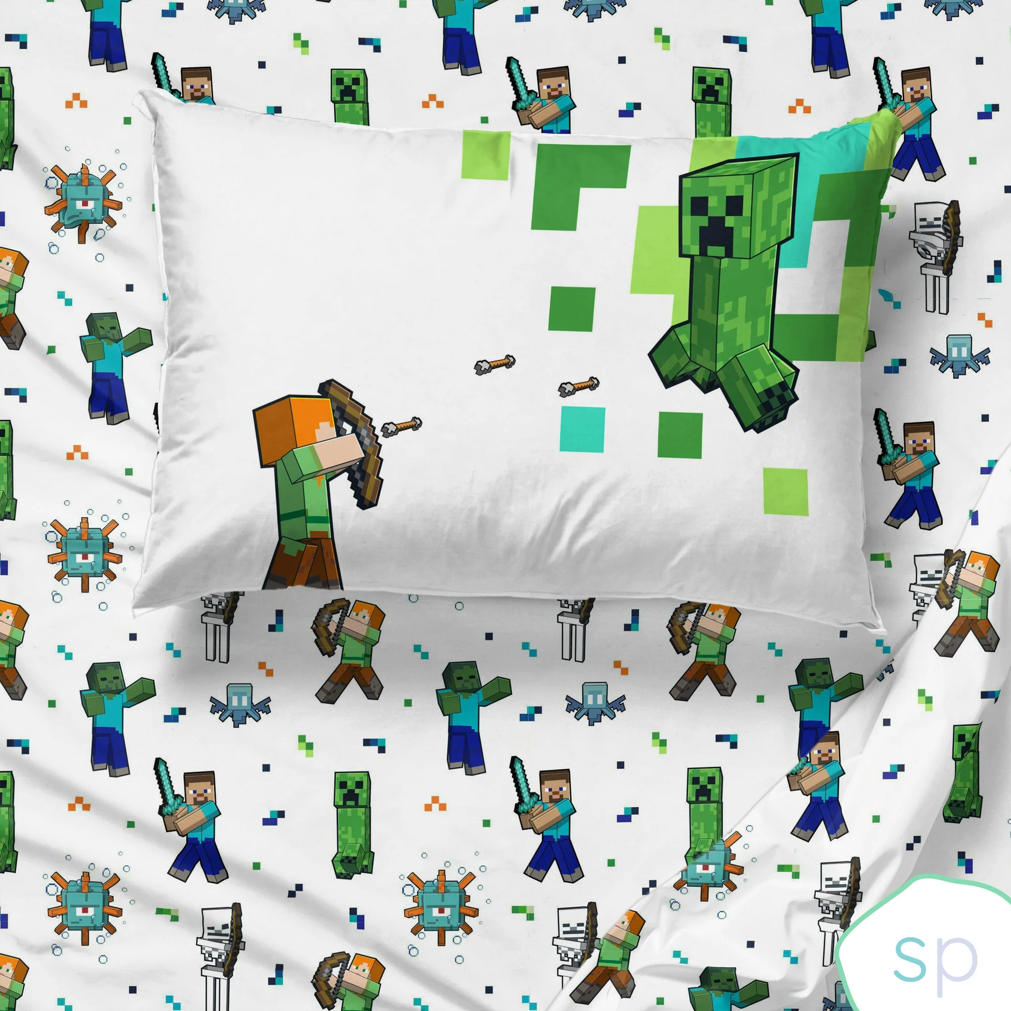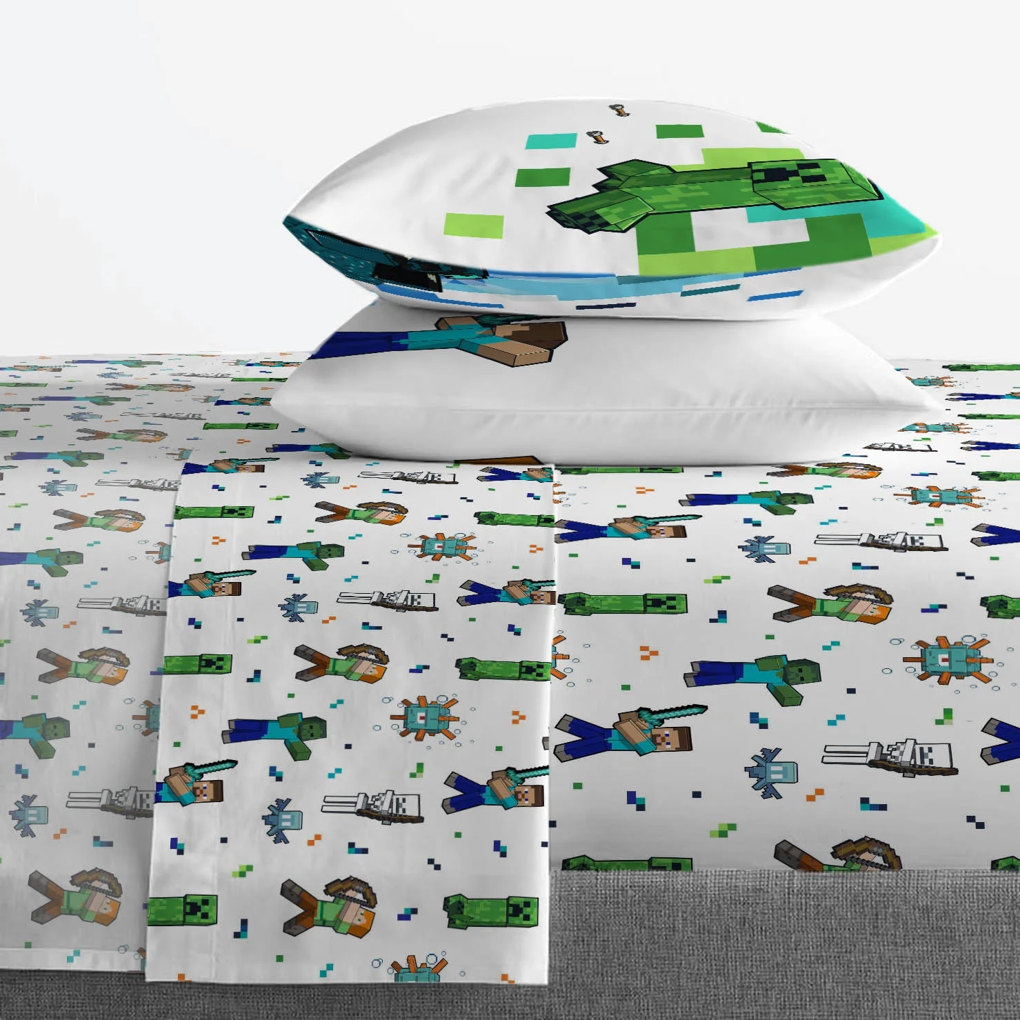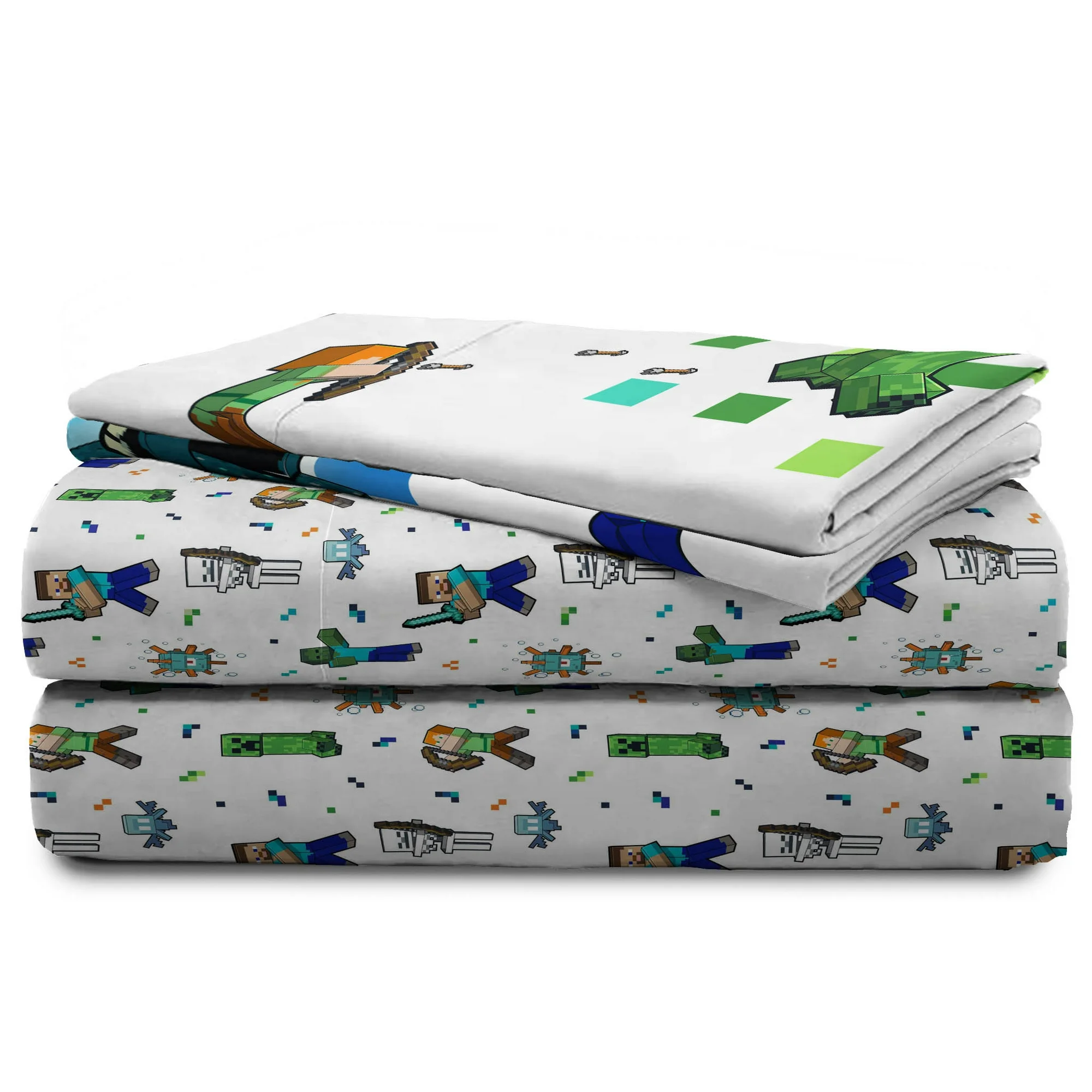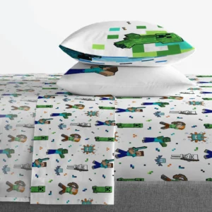 Juego completo: Incluye una sábana ajustada, una sábana plana y dos fundas de almohada reversibles, todas con un tema coordinado de Minecraft.