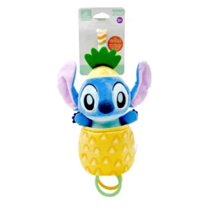 ¡Cucú! Stitch se esconde en su suave y táctil piña. Tira de los anillos de clic-clac y siente la vibración mientras regresa a su escondite. Engancha este juguete a la carriola para entretenerte en cualquier lugar o usa los mordedores para calmar el dolor de dientes. Lavar a mano. Apto para todas las edades.