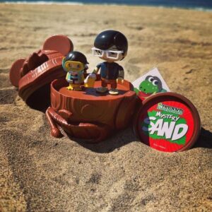 El mini huevo Tiki incluye una figura misteriosa, una microfigura, arena cinética y una pegatina.