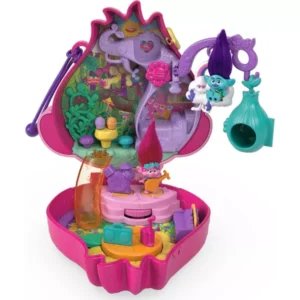 ¡Experimenta el doble de diversión con DreamWorks Trolls y Polly Pocket en este compacto de colaboración! El adorable exterior con temática de Poppy con cabello se abre para revelar el mundo de Trolls donde las muñecas Poppy y Branch pueden jugar todo el día. Hay 13 accesorios extravagantes y 5 funciones de narración en el compacto. Los niños pueden enviar a las muñecas por el tobogán, peinarlas o utilizar las funciones Pop & Swap para colgarlas en el escenario para una sesión de sonido rockera. Tómate un descanso y comparte algunas golosinas en el jardín de Trolls antes de pasar el rato en sus cápsulas para descansar después de un largo día. ¡Este compacto con temática de Trolls tiene sorpresa y aventura en cada esquina y cuenta con una correa para la muñeca para divertirse fácilmente en movimiento! Es un gran regalo para niños de 4 años en adelante. Los colores y las decoraciones pueden variar.