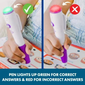 Pluma interactiva: Proporciona retroalimentación de audio y se ilumina en verde para respuestas correctas, y en rojo para respuestas incorrectas. Los sonidos pueden ser silenciados. (El pen requiere 2 pilas AAA, no incluidas)