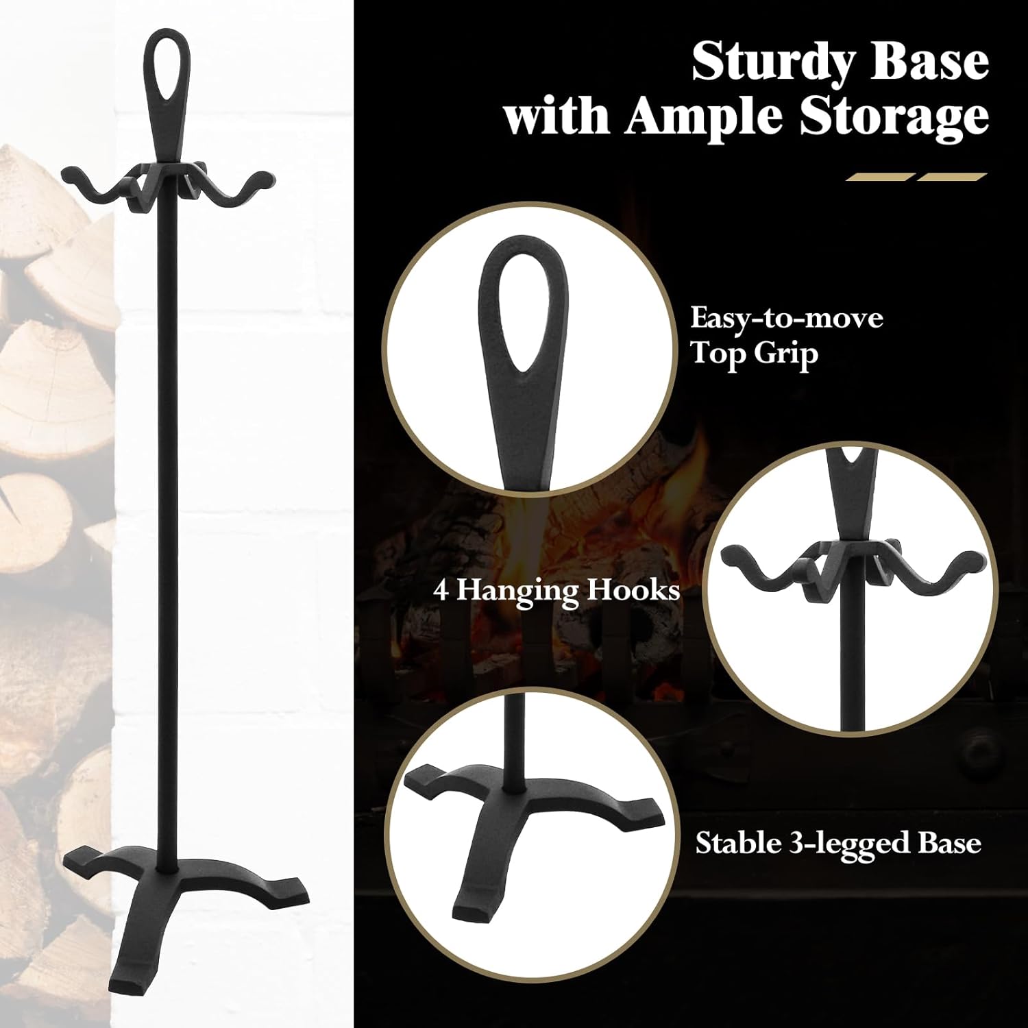 Base resistente y diseño portátil: con una base estable de 3 patas, este juego de herramientas contra incendios se puede colocar de forma segura junto a tu chimenea, y el agarre superior hace que sea fácil de mover a otras habitaciones. Además, los 4 ganchos para colgar proporcionan una manera conveniente para pósters de fuego, cepillos de cenizas, pinzas de fuego u otros accesorios para almacenar y mantener el área de tu chimenea ordenada y organizada.