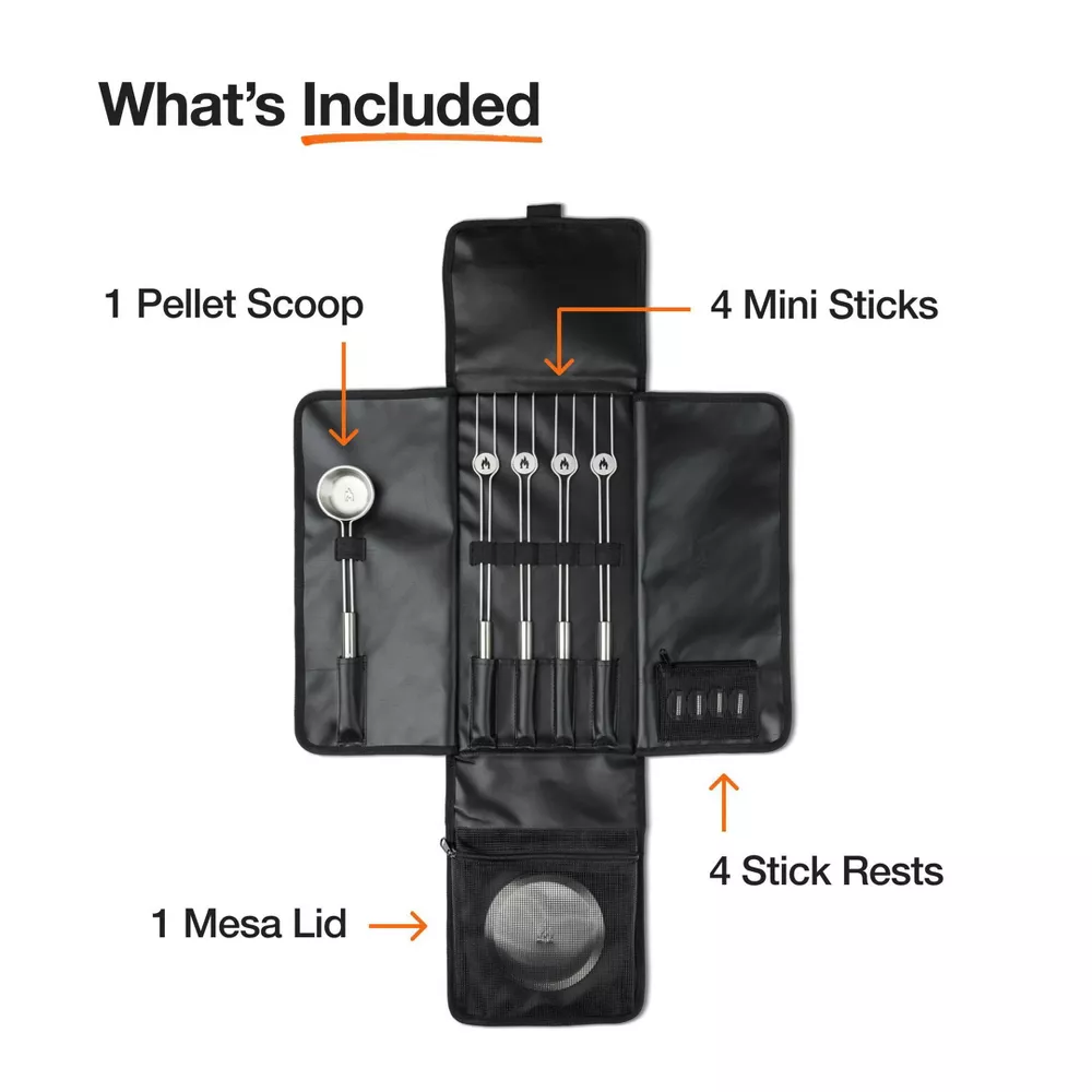 «Que la diversión junto a la chimenea siga viva. Amplía la experiencia de tu fogata de mesa Mesa XL con el paquete de accesorios Mesa. Empieza a asar malvaviscos dorados con varillas para asar en miniatura de acero inoxidable y soportes. Enciende llamas sin humo con una cuchara para pellets y enfríalas después con la tapa de tu Mesa. Una vez que termine la fiesta, guárdalo todo en un estuche de transporte que maximiza la portabilidad y el almacenamiento.»