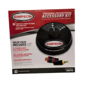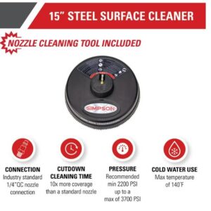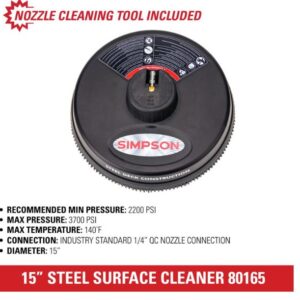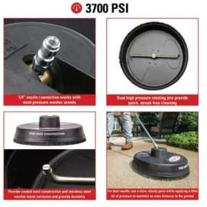- Compatibilidad y potencia: esta fregadora de superficie funciona con la mayoría de las lavadoras a presión a gas con clasificaciones entre el mínimo recomendado de 2200 PSI y 2,3 GPM hasta un máximo de 3700 PSI y 3,4 GPM; El limpiador de superficies es solo para uso con agua fría; temperatura máxima 140 grados F.