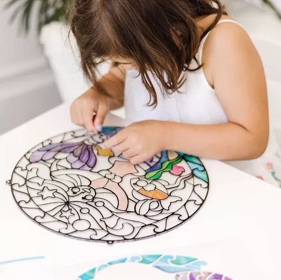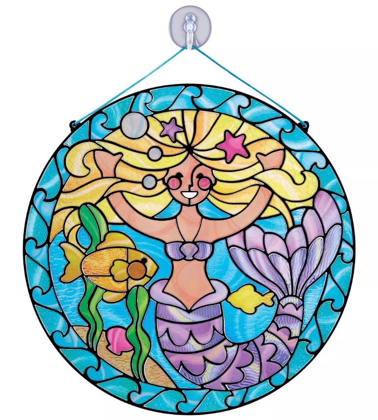 Esta manualidad con pegatinas que se despegan y presionan les brinda a los niños todo lo que necesitan para crear fácilmente una espectacular obra de arte en forma de «vitral». Simplemente coloque la hoja de pegatinas de colores sobre el marco transparente, quítelas una a la vez y péguelas. Las ranuras y los contornos del marco facilitan la colocación de cada pegatina (que presenta texturas realistas como burbujas o remolinos) en el lugar correcto. Utilice el cordón y la ventosa incluidos para colgar la obra de arte terminada en una ventana soleada y ver cómo la encantadora sirena cobra vida. ¡Los jóvenes artistas quedarán encantados con los resultados y orgullosos de mostrarlos!