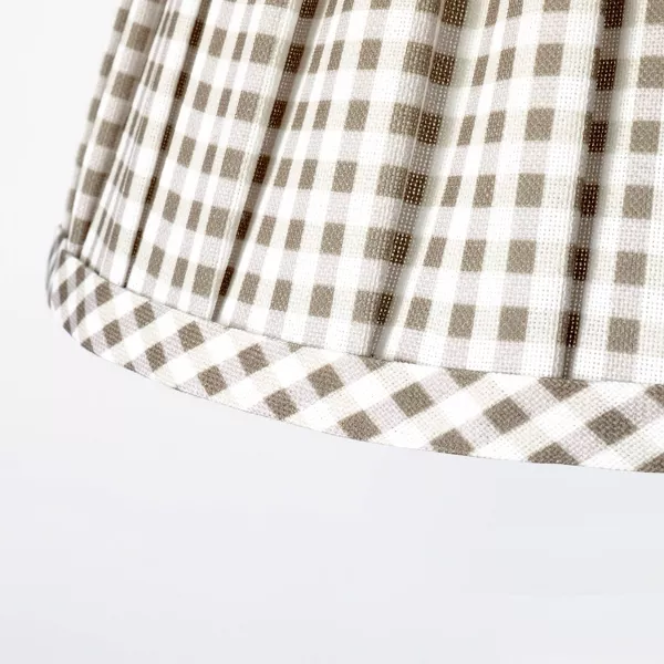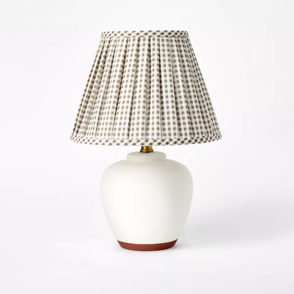 Añada un encanto atemporal a la iluminación de su hogar con esta lámpara de mesa de cerámica con pantalla plisada y estampado de cuadros vichy de Threshold™, diseñada en colaboración con Studio McGee. Esta exclusiva lámpara de mesa cuenta con una base de cerámica blanca y marrón, y una pantalla plisada estilo imperio con estampado de cuadros vichy para un estilo clásico. El interruptor giratorio de encendido/apagado facilita su uso. Colóquela en la mesa auxiliar o consola de su sala de estar para disfrutar de una iluminación cálida y ambiental.