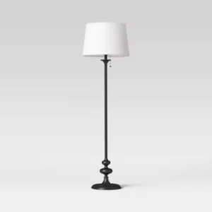 Lámpara de pie de metal negro con base torneada y pantalla de tela tipo tambor.