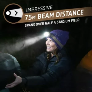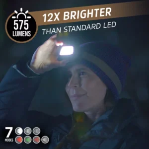 La luz LED emite 575 lúmenes con un haz de 75 metros (246 pies) durante hasta 21 horas en modo bajo.