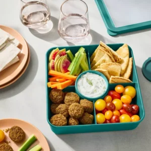 Guarda bocadillos, ensaladas y otros alimentos fácilmente con el contenedor grande para bocadillos Bento de Figmint™. Este contenedor grande cuenta con múltiples compartimentos divididos para ofrecerte amplio espacio para salsas y más. Su cierre hermético evita derrames y suciedad, mientras que su diseño apto para microondas (sin tapa) permite recalentarlo rápidamente. Fabricado con plástico libre de BPA, este contenedor es ideal para el día a día, tanto en casa como de viaje. Y lo mejor de todo: se puede lavar en el lavavajillas para una limpieza fácil.