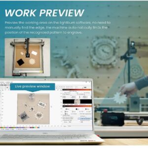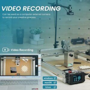 Grabación de video HD con gran angular: la cámara inteligente AC1 tiene una lente industrial gran angular, con un rango de disparo de 15.748 x 15.748 in, y es perfectamente adecuada para máquinas de grabado de marco dentro de 17.717 x 17.717 in. A través del disparo retrasado de la cámara, puede grabar todo el proceso de finalización del trabajo, lo que hace que el grabado y el corte sean visibles y observables. También comparte tus videos creativos con otros o con la plataforma de red
