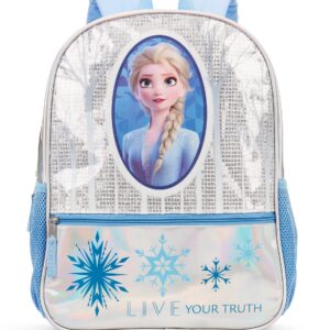 Mochila grande Frozen 2. Esta mochila tiene un compartimento principal y un bolsillo frontal para accesorios con cierres de cremallera. Correas de hombro ajustables, un asa de bucle de taquilla superior y bolsillos de malla de aire se incluyen en esta mochila. Lleva a Elsa y esta moderna mochila de lentejuelas a la escuela todo el día.