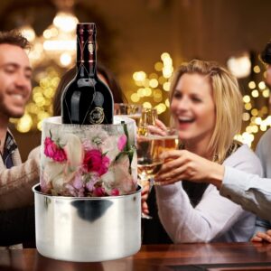 Molde de hielo de champaña fácil de hacer: simplemente llena el molde con agua (el hielo más claro se puede obtener con agua destilada). y tus artículos deseados, congela durante 12 a 24 horas, y luego colócalo en la base de la bandeja con tu botella dentro. El cubeta enfriador de vino puede contener champaña, vino, cócteles, cerveza, jugo o cualquier bebida.