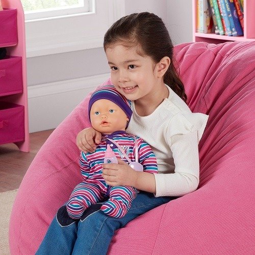 My Sweet Love Diseñada para una interacción realista, esta encantadora muñeca viene con un mono a rayas y gorro de dormir, chupete y biberón a juego. La muñeca de juguete crea horas de diversión imaginativa con respiración similar, succión de biberón y risas y una cara que se mueve como un bebé real para interactuar con el juego de su hijo.