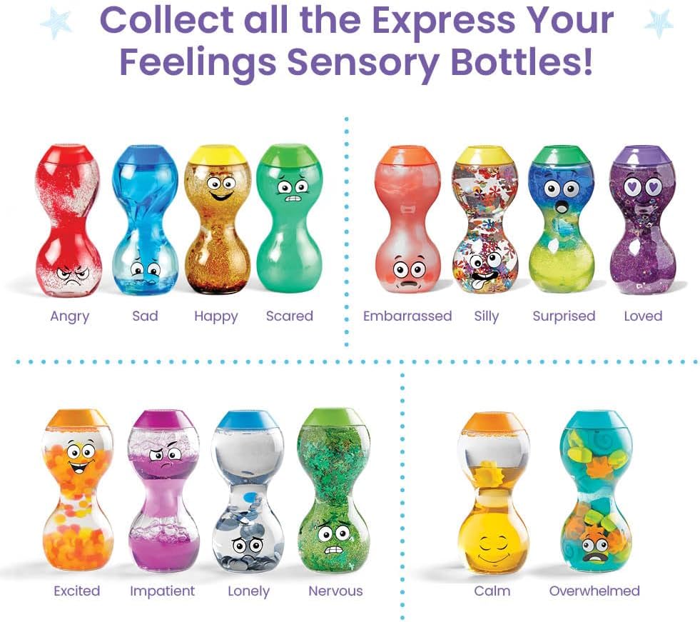 Presentamos una extensión de nuestras exitosas Botellas Sensoriales «Expresa tus Sentimientos» con aún más sentimientos: ¡Avergonzado, Tonto, Sorprendido y Amado! Ofrezca a los niños una forma tranquila y práctica de identificar sus emociones y resolverlas. Ayude a los niños a usar pistas faciales y corporales para hacer conexiones entre sus propios sentimientos y las expresiones en las botellas. Cada atractiva botella tiene un diseño único con su propia expresión facial, color y elemento interactivo que encarna un sentimiento diferente. El contenido de cada botella representa el sentimiento que se muestra en su cara. Los niños eligen la botella que representa cómo se sienten y luego la agitan, giran y giran para ayudarlos a gestionar sus sentimientos. ¡Estas botellas sensoriales son la herramienta perfecta para ayudar a los niños a autorregularse y a iniciar conversaciones sobre sus sentimientos y los de las personas que los rodean! Las botellas fáciles de agarrar y con cierre seguro brindan a los niños la práctica necesaria para desarrollar la autoconciencia, la autogestión y la conciencia social.