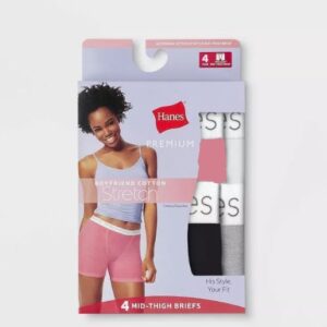¿Buscas un calzoncillo inspirado en un novio que sea todo de niña? No busque más, los calzoncillos de algodón elásticos hasta la mitad del muslo Boyfriend Premium para mujer de Hanes. La cintura suave y elástica Comfort Flex y la tela elástica de algodón hilado en anillos brindan libertad de movimiento y se sienten suaves contra la piel. El corte a la mitad del muslo le brinda un ajuste de cobertura total de tiro medio. Sin etiquetas y disponibles en un conveniente y surtido paquete de 4, los calzoncillos tipo bóxer de algodón elástico Boyfriend Premium para mujer de Hanes te permiten tenerlo todo: un calzoncillo de novio a la mitad del muslo con un ajuste que es todo de niña.