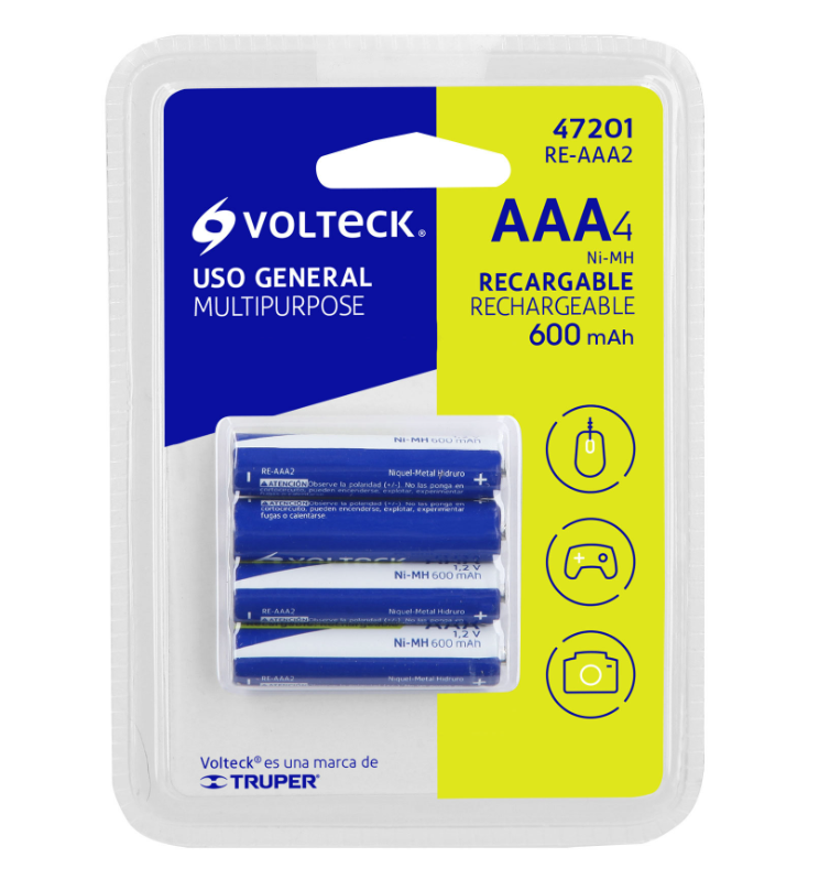 Cuatro pilas recargables AAA, 600 mAh, uso general. Las pilas recargables son de mayor duración que las normales y menos perjudiciales para el medio ambiente.