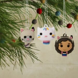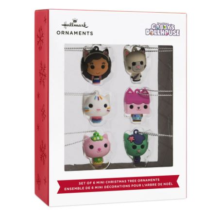 - Hacer las vacaciones purr-fect con este conjunto de 6 miniatura «Gabby’s Dollhouse» adornos de Navidad Hallmark. Incluye versiones estilizadas de Gabby, Pandy Paws, MerCat, Cakey, Kitty Fairy y Baby Box.
