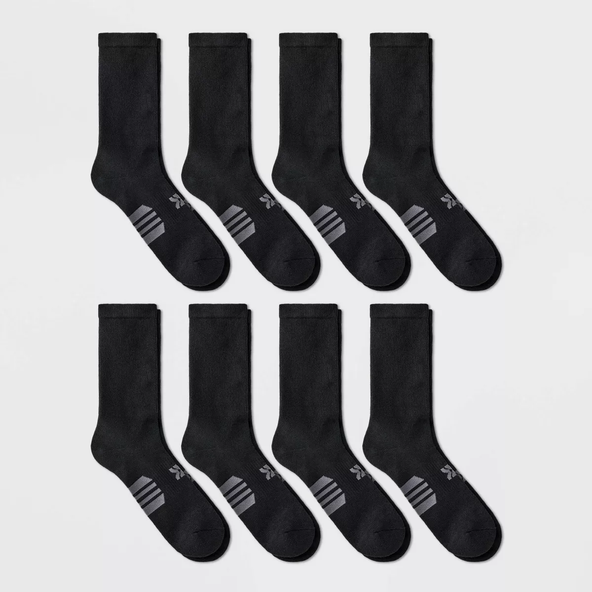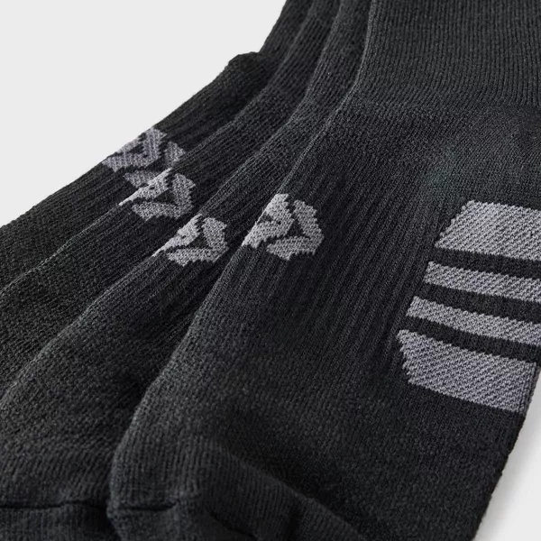 Pack de calcetines deportivos acolchados negros con diseño de rayas estratégicamente ubicadas y el logotipo de la marca. Fabricados con una mezcla de poliéster reciclado de peso medio que absorbe la humedad, elastano y malla transpirable para mantener los pies frescos y cómodos. El soporte del arco del pie, la amortiguación en las zonas del pie que lo necesitan y el refuerzo del talón y la puntera completan su cómodo ajuste. Además, el pack incluye ocho pares para que tengas calcetines a mano para cualquier ocasión.