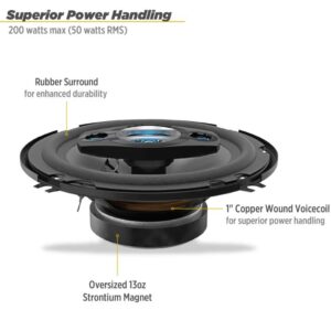 - El woofer de 6,5 pulgadas, el rango medio de 1,2 pulgadas y los tweeters duales de 0,6 pulgadas proporcionan hasta 200 vatios de potencia máxima y 50 vatios de RMS por altavoz para un mayor rendimiento.