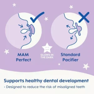 ¡Se acabó la frustración de intentar encontrar tus chupetes perdidos por la noche! Este chupete brilla en la oscuridad, lo que facilita que el bebé y los padres lo encuentren por la noche. Especialmente diseñado teniendo en cuenta los dientes y la mandíbula de tu pequeño, el chupete MAM Perfect está clínicamente probado* para reducir el riesgo de mordida abierta y sobremordida en etapas posteriores de la vida
