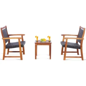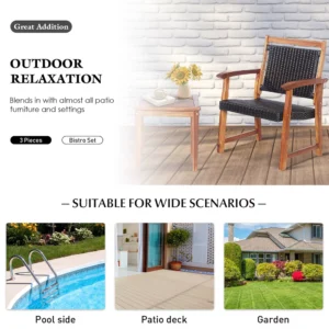 Juego de muebles de madera de acacia: este juego de bistró para patio elige madera de acacia sólida y tenaz para construir una estructura fuerte para sus sillas y la mesa. Adquirir un marco tan resistente significa que este conjunto de muebles tiene una gran resistencia para soportar el uso diario y una gran capacidad para soportar cargas.