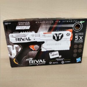 ¡Las batallas de Nerf Rival nunca serán las mismas! Entra en batalla como miembro del equipo de Phantom Corps con el bláster Kronos XVIII-500 cargado de nalgas que presenta el color y el logotipo de identificación del equipo. Abra la recámara para cargar 5 rondas de alto impacto en el blaster, luego ciérrela con el mecanismo de armado de acción de resorte, apunte y dispare.