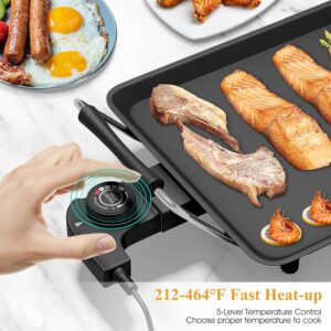 5 controles de temperatura ajustables: nuestra plancha eléctrica antiadherente extragrande cuenta con una temperatura ajustable de 5 niveles que oscila entre 222 y 550 °F/100 a 240 ℃. Simplemente ajusta el termostato de control para ajustar tu calor personalizado desde freír a baja temperatura hasta abrasar a alta temperatura, haciendo deliciosa comida cada vez.