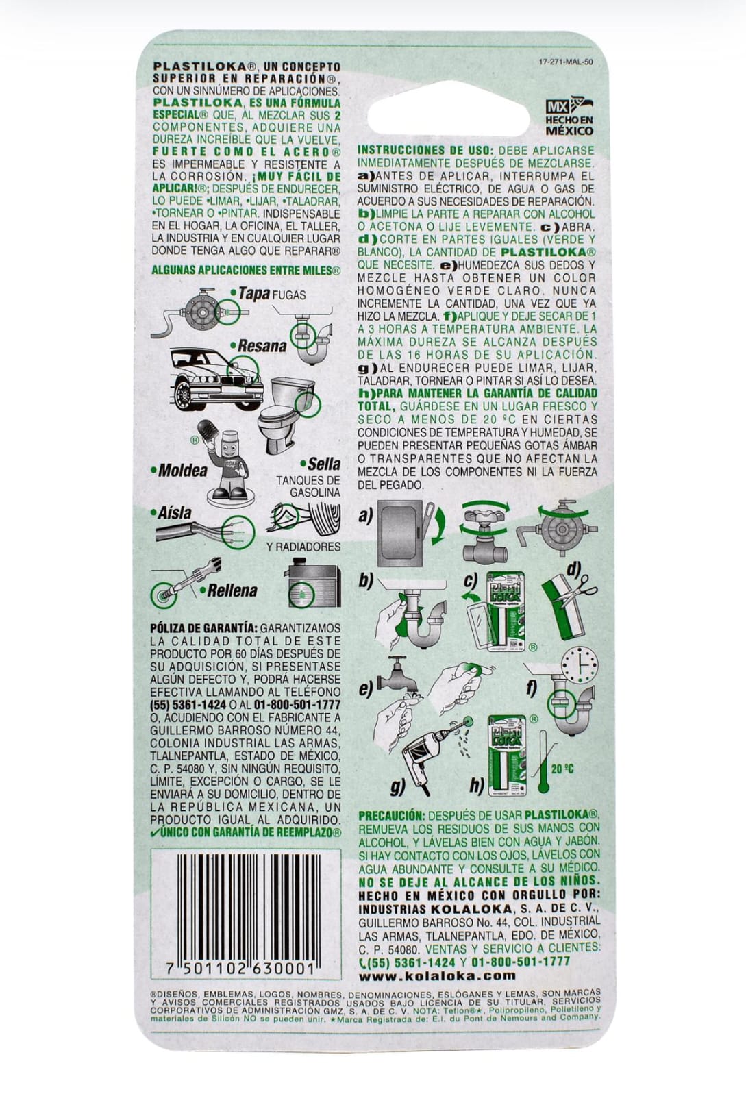 plastiloka®, un concepto superior en reparación®, con un sinnúmero de aplicaciones. plastiloka es una fórmula especial® que, al mezclar sus 2 componentes, adquiere una dureza increíble que la vuelve, fuerte como el acero® es impermeable y resistente a la corrosión. ¡muy fácil de aplicar!®; después de endurecer, lo puede limar, lijar, taladrar, tornear o pintar. indispensable en el hogar, la oficina, el taller, la industria y en cualquier lugar donde tenga algo que reparar®