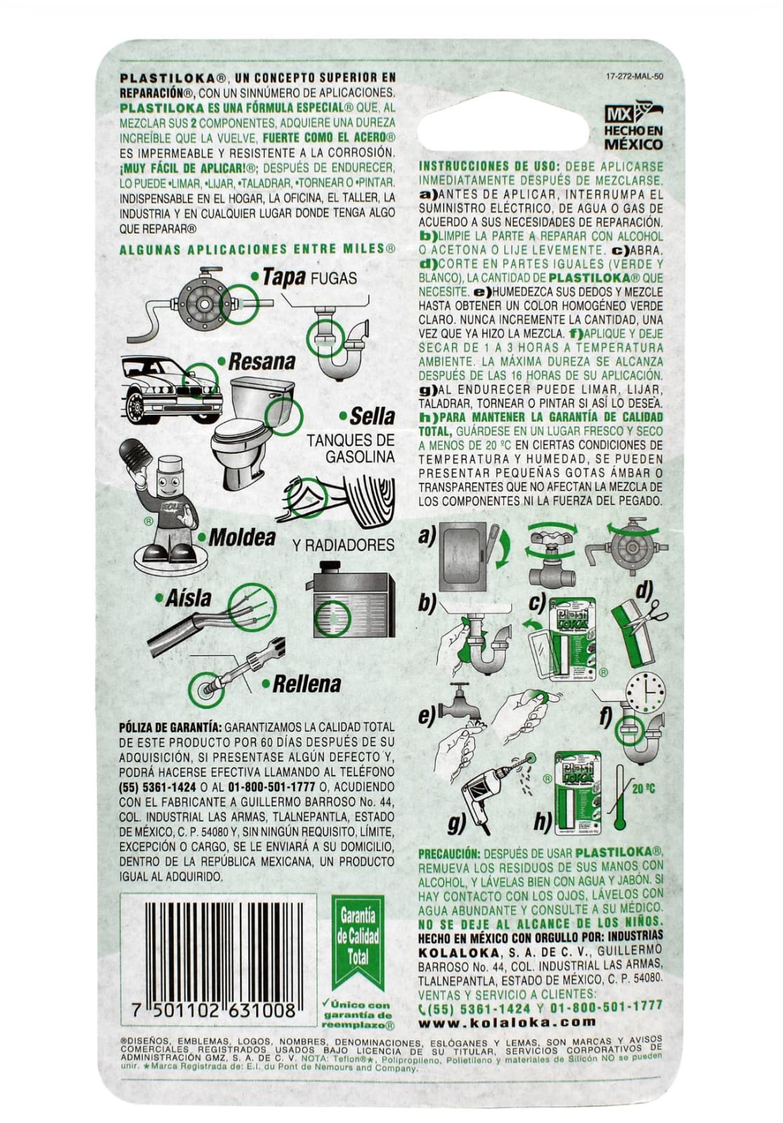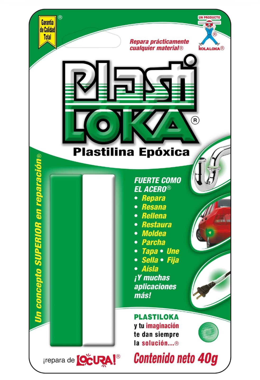 plastiloka®, un concepto superior en reparación®, con un sinnúmero de aplicaciones. plastiloka es una fórmula especial® que, al mezclar sus 2 componentes, adquiere una dureza increíble que la vuelve, fuerte como el acero® es impermeable y resistente a la corrosión. ¡muy fácil de aplicar!®; después de endurecer, lo puede limar, lijar, taladrar, tornear o pintar. indispensable en el hogar, la oficina, el taller, la industria y en cualquier lugar donde tenga algo que reparar®