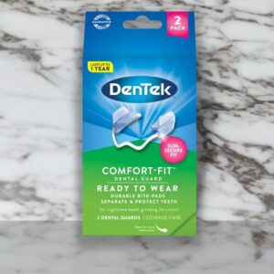 - Los protectores dentales DenTek Comfort-Fit están listos para usar con un ajuste delgado y seguro en los dientes inferiores para brindar el mismo nivel de protección que un protector dental de cobertura total