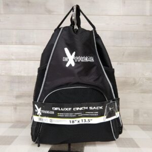 Saco Cinch Extreme Deluxe. Hecho de 100% poliéster para mayor durabilidad. Este saco cinch cuenta con un gran compartimento principal, un bolsillo frontal de malla y bolsillos laterales. Este saco Cinch es un material liviano, tiene correas laterales y un asa superior para mayor comodidad. 18 «de largo y 13.5» de ancho.