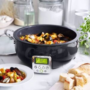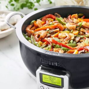 - Una tapa de vidrio templado le permite vigilar su comida y observar cómo se desarrolla el sabor.
