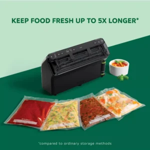 La selladora al vacío mantiene los alimentos frescos hasta 5 veces más tiempo en comparación con los métodos de almacenamiento habituales y evita las quemaduras por congelación para que puedas desperdiciar menos y hacer rendir más tu dinero en alimentos