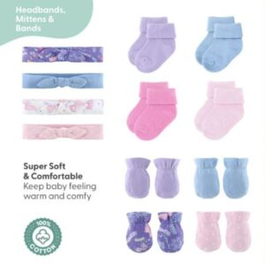 - Accesorios de layette para bebé: 4 lazos, 4 pares de mitones de protección contra rasguños, 4 pares de calcetines y 3 baberos