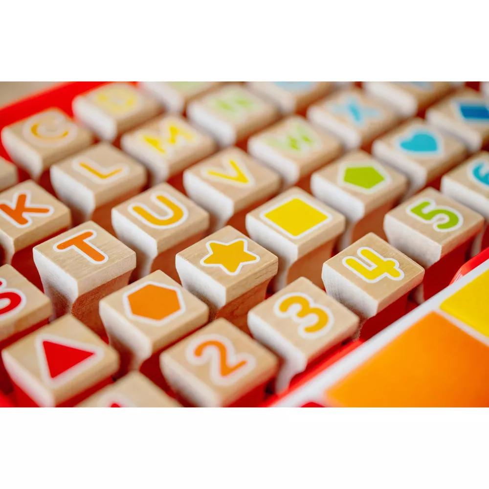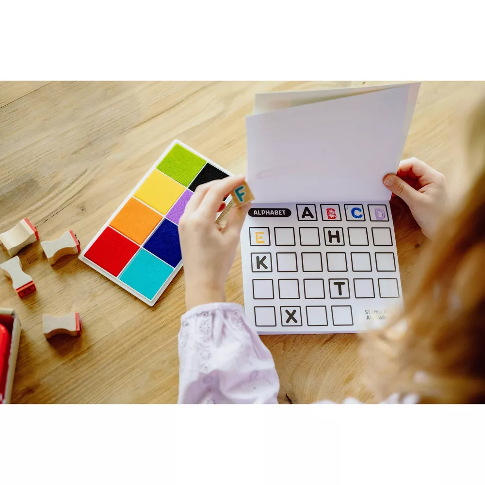 48 sellos duraderos y fáciles de sujetar, fabricados en madera de abedul de alta calidad. ¡Libro de actividades con sellos de 50 páginas, con letras, números y formas para aprender jugando!