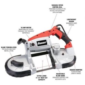 La alta velocidad, una mejor movilidad y una capacidad de corte extra grande de 5 pulg. X 5 pulg. Hacen que esta sierra de banda, sea una de las herramientas más útiles en cualquier lugar de trabajo. Con tres rodamientos de rueda para precisión, esta banda corta a través de tubos, varillas, barras de refuerzo, madera, metal y plástico.
