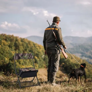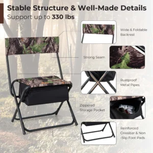 Características cómodas y convenientes: Esta silla de caza está diseñada con un respaldo ancho y plegable para dar un amplio apoyo a su cuerpo durante mucho tiempo sentado. Además, el bolsillo con cremallera debajo del asiento crea un espacio de almacenamiento espacioso para sus pertenencias personales.