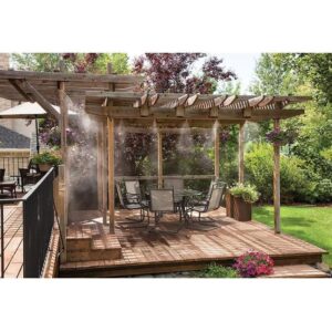 El sistema de enfriamiento por niebla reducirá la temperatura exterior hasta 20°F. Se ensambla en solo minutos con accesorios deslizantes de latón ultraduraderos que giran 360° para dirigir la niebla a donde desee. Este sistema flexible de alta calidad se puede ampliar hasta 124 pies y permite un rendimiento mejorado con la adición de una bomba de refuerzo.