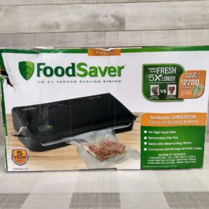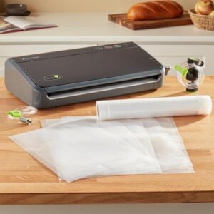 Sellador al vacío con rollo de almacenamiento y cortador FoodSaver, FM2100-000 Sellador al vacío, construido en rollo de almacenamiento y cortador, incluye 3 bolsas de tamaño QT, bolsas de 2 galones, un rollo de 11 » x 10 ‘, 1 manguera accesoria, funciona con todos los FoodSaver y Seal-A-Meal Bolsas y botes.