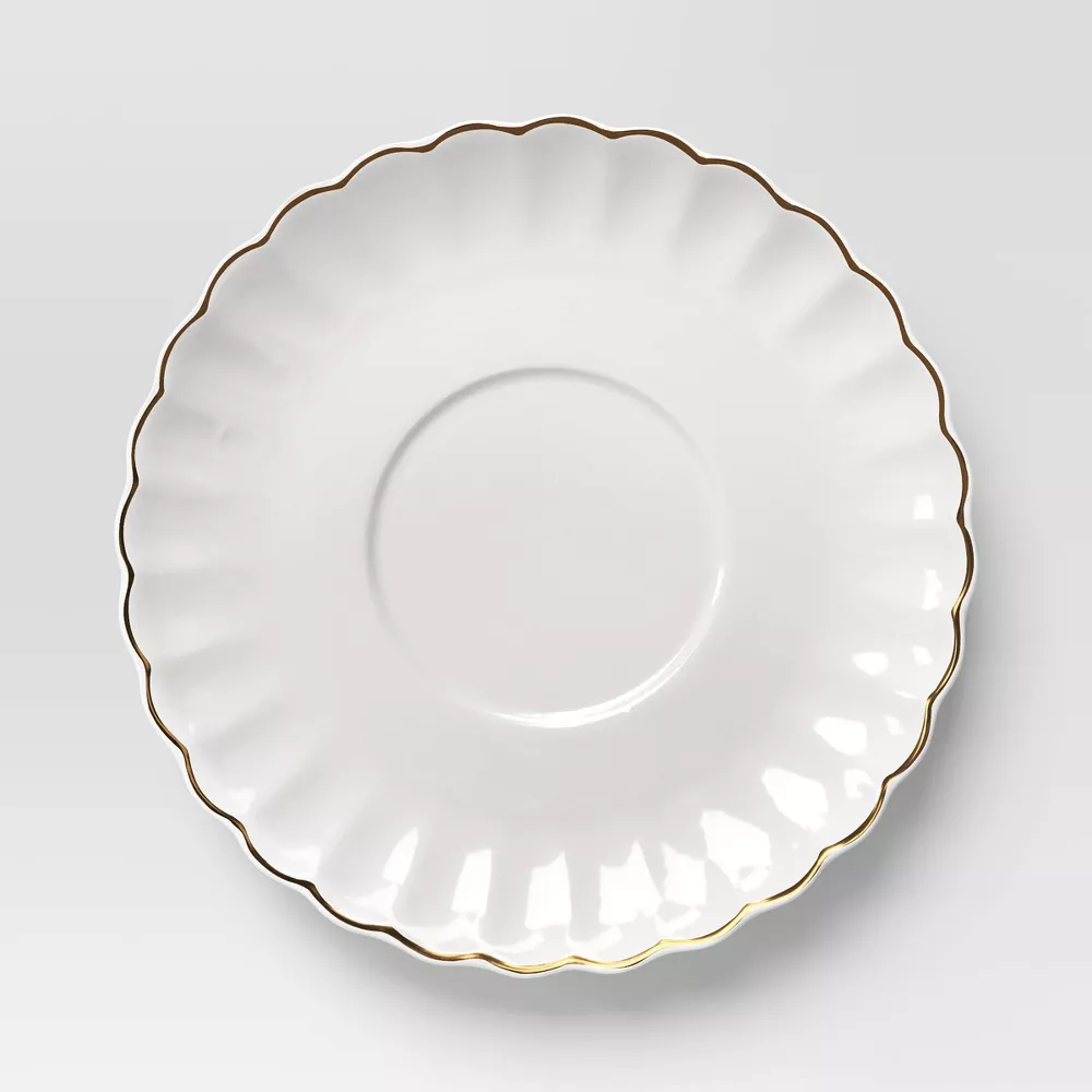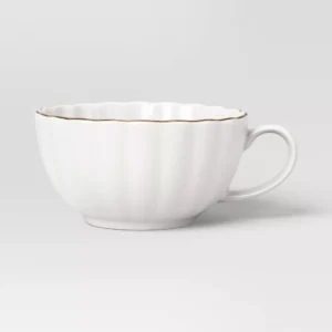 Disfrute de su taza de té o café matutino en esta taza de té de gres con plato de Threshold™. Esta taza color crema, acompañada de su plato, presenta un diseño festoneado con un borde en tono dorado que le confiere un aspecto sofisticado. Fabricada en gres, la taza está diseñada para servir bebidas calientes y es apta para microondas, lo que facilita su recalentamiento.