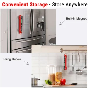 : El termómetro de cocina utiliza un diseño de sonda plegable para plegarse fácilmente y bloquearse en la base para mayor portabilidad; La parte posterior y el gancho magnéticos permiten un almacenamiento conveniente