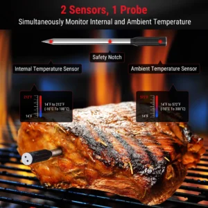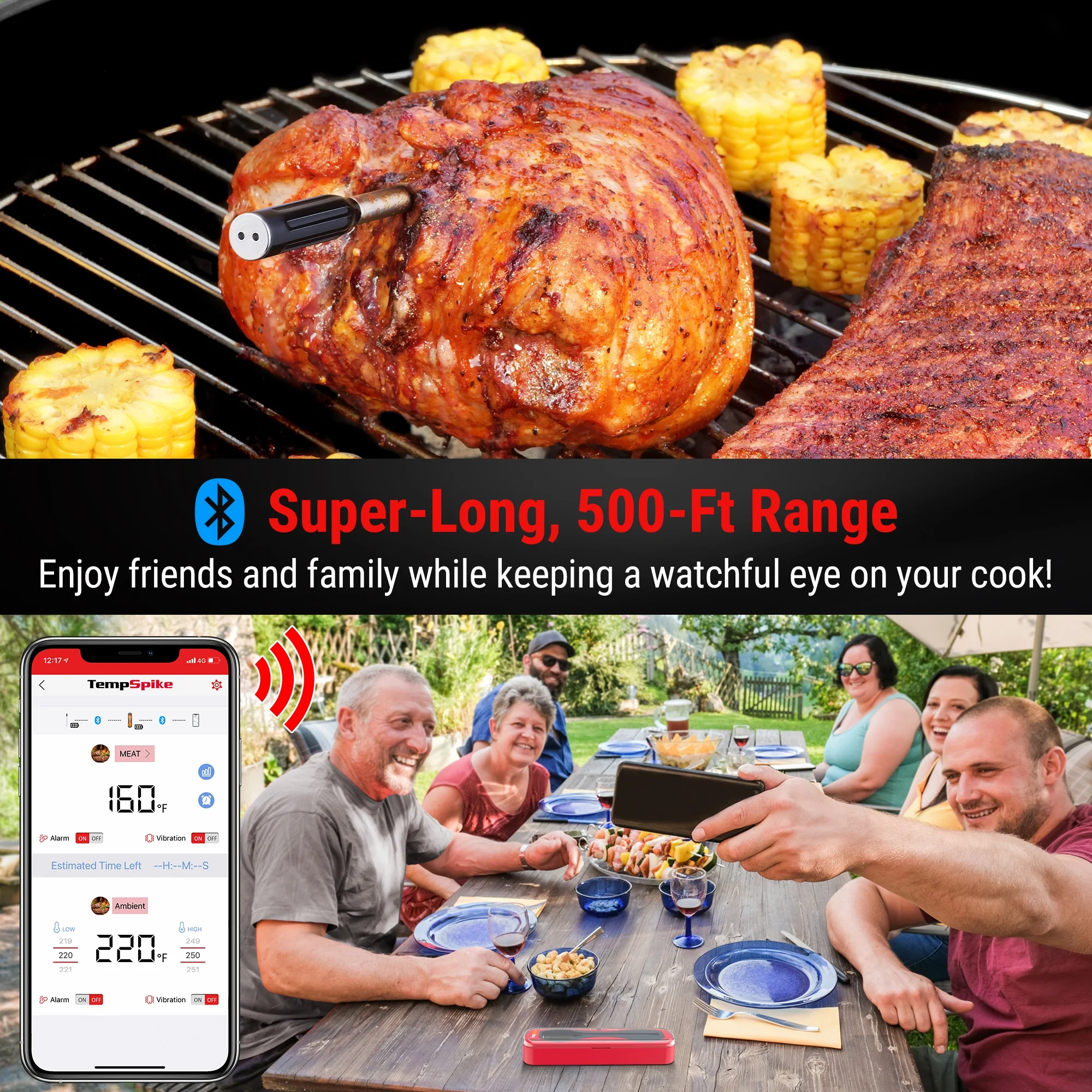 ¡Bienvenido a truly wireless Grilling! Equipado con 2 sondas en 1, el ThermoPro TP960W TempSpike le permite controlar 1 pieza de carne y la temperatura ambiente en su parrilla o fumador, al mismo tiempo. Con el alcance de la señal de 500 pies, no tiene que seguir revisando la carne en la parrilla o el ahumador. Simplemente revise su teléfono inteligente para vigilar el progreso de su cocinero mientras trabaja libremente en algo en la cocina o ve el juego en la sala de estar. Perfecto para fumar y asar todo tipo de carne fuera de la casa o usarla en interiores, ya sea que esté horneando algo en el horno o quemando un filete en la estufa. Cocinar completamente inteligente y manos fuera con el ThermoPro TempSpike.