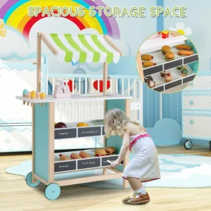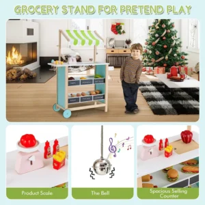 EXPERIENCIA DE MERCADO COMPLETA: Este colorido juguete de mercado de tienda de comestibles de madera tiene todo lo que necesita para simular un mercado de agricultores, incluidos seis espacios de almacenamiento, seis helados, básculas, pizarrones y campanas. El amplio espacio de almacenamiento se puede usar para frutas y verduras, así como otros accesorios de cocina de juguete. Puede escribir el nombre del producto o el precio en la pizarra.