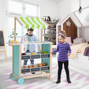 INSPIRE EL JUEGO INTERACTIVO Y EL DESARROLLO SOCIAL: Este puesto de comestibles de madera y la simulación de juego de roles de una tienda de comestibles fomentan la imaginación creativa, la interacción social y el desarrollo del lenguaje. Los niños pueden intentar practicar las habilidades de comunicación en la conversación, aprender vocabulario nuevo, resolver conflictos, observar resultados y fortalecer sus habilidades interpersonales.